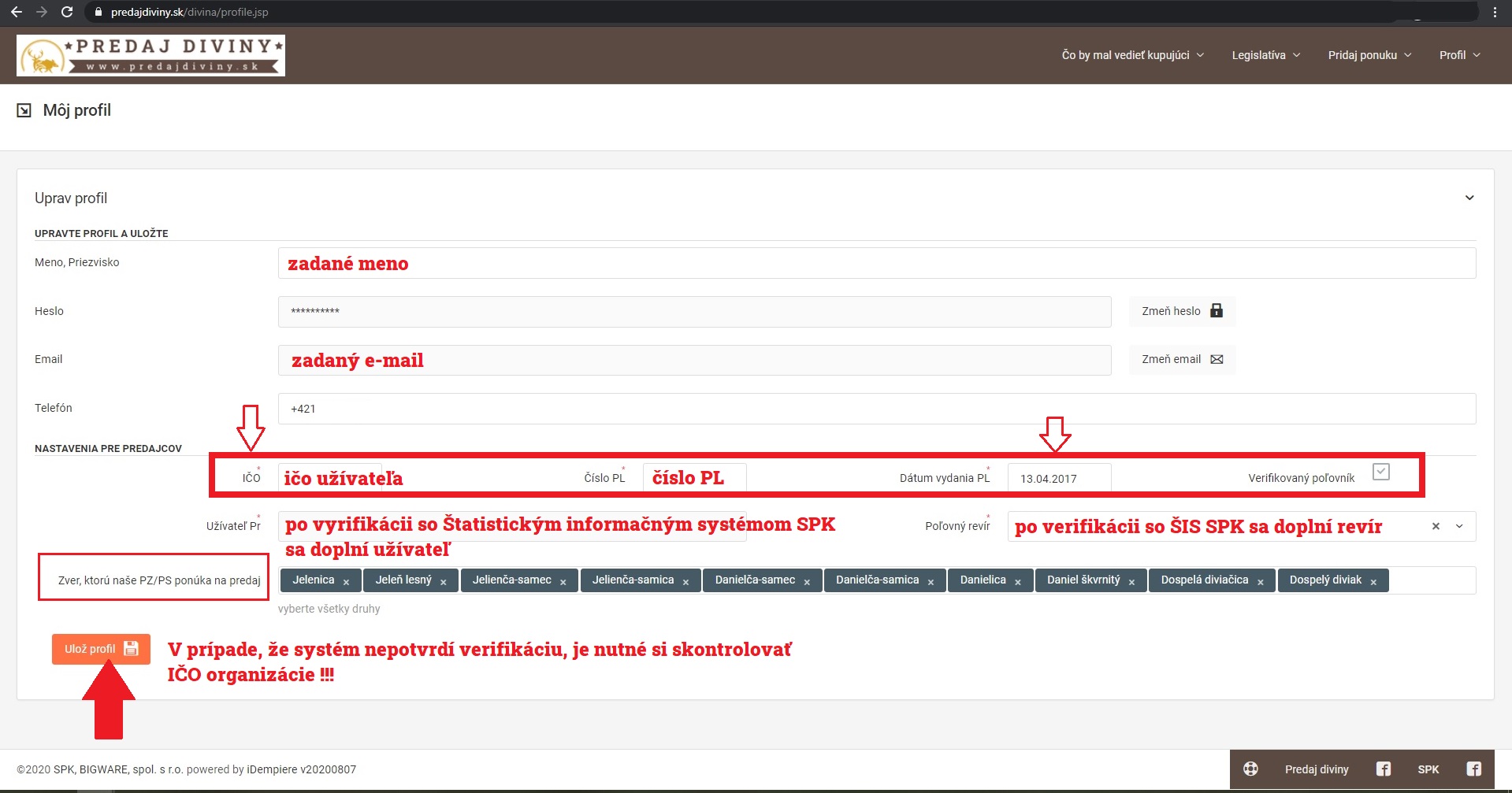 2. Člen PZ/PS/PO musí mať pri registrácii predajcu uvedené číslo poľovného lístka, dátum jeho vydania a IČO organizácie, ktorej je členom. Až po tomto úkone ho môže štatutár/hospodár potvrdiť vo svojom profile.